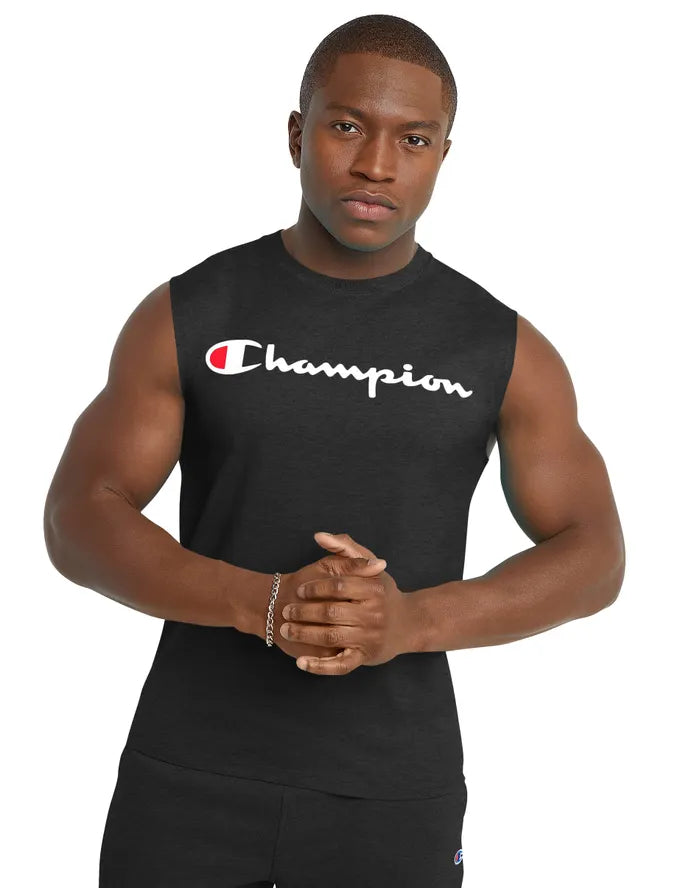 This muscle tank is the perfect sleeveless men's t-shirt for anything from the pool to the beach or to the gym. You'll love this shirt for all occasions, made from a comfortable cotton or cotton blend that's extra soft. With its bound collar and sturdy stitchwork, this top is designed to be a longtime fave. The classic script logo spans the chest of this muscle tee for men, offering a sport-inspired look, while the iconic C logo sits at the back neck for added brand recognition. Pair this shirt with your best Champion shorts or joggers for an athletic look.
