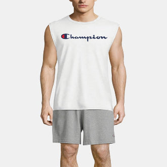 This muscle tank is the perfect sleeveless men's t-shirt for anything from the pool to the beach or to the gym. You'll love this shirt for all occasions, made from a comfortable cotton or cotton blend that's been ringspun for softness. With its bound collar and sturdy stitchwork, this top is designed to be a longtime fave. The classic script logo spans the chest of this muscle tee for men, offering a sport-inspired look, while the iconic C logo sits at the back neck for added brand recognition. Pair this shirt with your best Champion shorts or joggers for an athletic look.