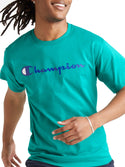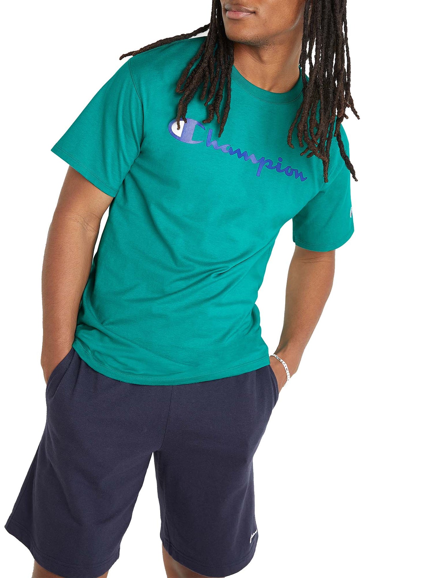 Our Jersey Cotton Tee, it's always in season with iconic Champion graphics. Cotton jersey is ring-spun with a higher stitch density for durability and softness (Greys are a cotton-rich blend).