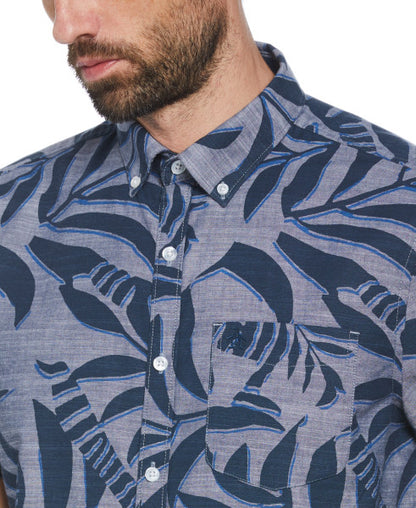 Original Penguin Chambray Leaves Print Short Sleeve Button-Down Shirt – Dress Blues