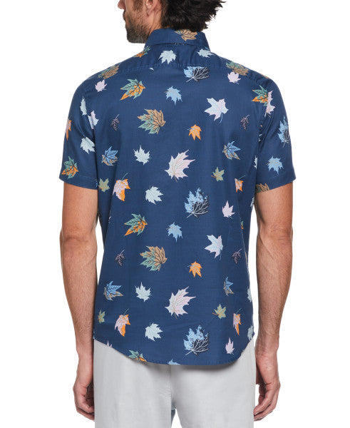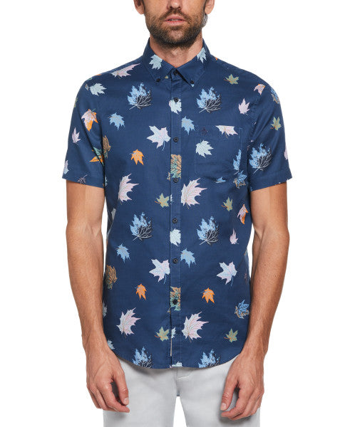 Original Penguin Maple Leaves Print Short Sleeve Button-Down Shirt - Poseidon Blue