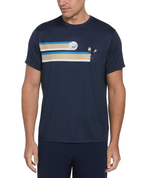 This Original Penguin men's short sleeve shirt is a real hit for tennis fans with its Pete graphic print. Expertly crafted with a crew neck design, this men's t-shirt is made from lightweight, breathable mesh fabric with moisture-wicking capabilities to ensure comfort. The recycled polyester fabric includes stretch for flexibility and easy movement, making it the perfect choice for a variety of activities. A retro 80s striped print shows Pete getting ready to smash a giant tennis ball with the Original Penguin logo on it.